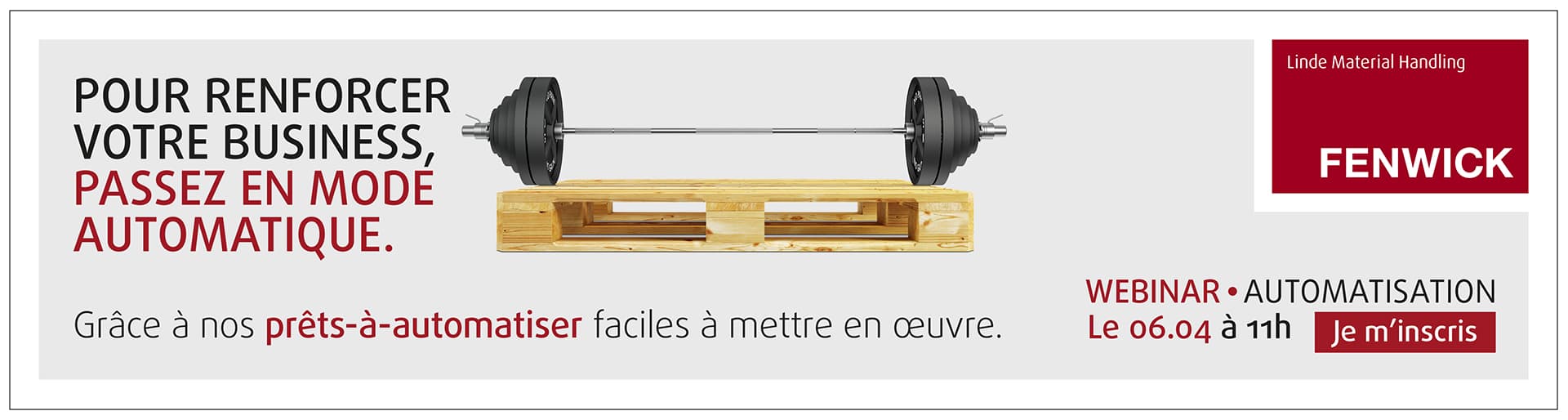 Notre client Fenwick - principal fournisseur de chariots élévateurs sur le marché français - nous a demandé de concevoir une campagne "bannering" sur le thème de l'automatisation. Diffusée sur ses supports propriétaires, cette campagne a pour mission d'interpeller les clients de Fenwick et de les inciter à en savoir plus sur les solutions d'intralogistique et d'automatisation.